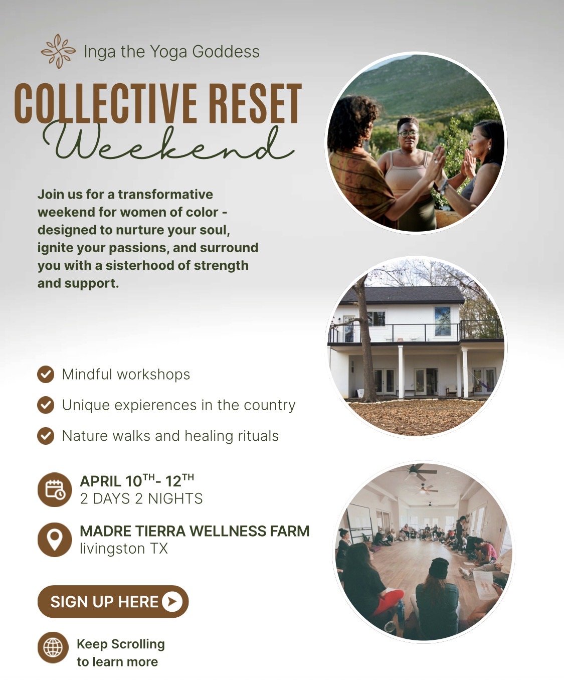 Back to All Events Collective Reset Weekend Friday, April 10, 2026 5:00 PM Sunday, April 12, 2026 6:00 PM Madre Tierra Wellness Farm 164 Annamarie Livingston, TX USA (map) Google Calendar ICS Learn more Learn more
